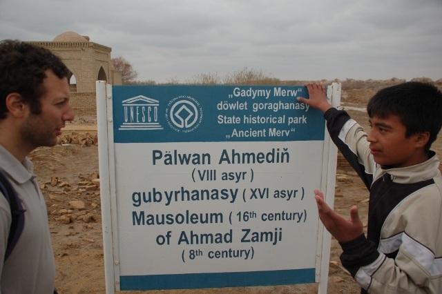 طبق نقشه در یک کیلومتری شمالِ غرب مقبرهی یوسف همدانی قرار دارد، که از صوفیان قرن پنجم است. به نظر بنای جدیدی میآید، ولی تصمیم میگیریم به آن سمت حرکت کنیم، به جاده و بعد هم ورودی آن محوطه وارد میشویم. انگار اینجا هم یکی از چندین ورودی سایت باستانی شهر مرو است، چون پارکینگ بزرگی دارد و در کنار پارکینگ دورهگردها بساط کردهاند و خنزرپنزر میفروشند. گیرهی سر، کلاه، مجسمههای گلی، روبان و جواهرات بدلی و چیزهایی از این دست. جداً این تعداد زیاد بچهها در خانوادههای ترکمن جالب توجه است. فکر کنم سه چهارم جمعیتی که ما دیدیم سنشان زیر 20 سال است.