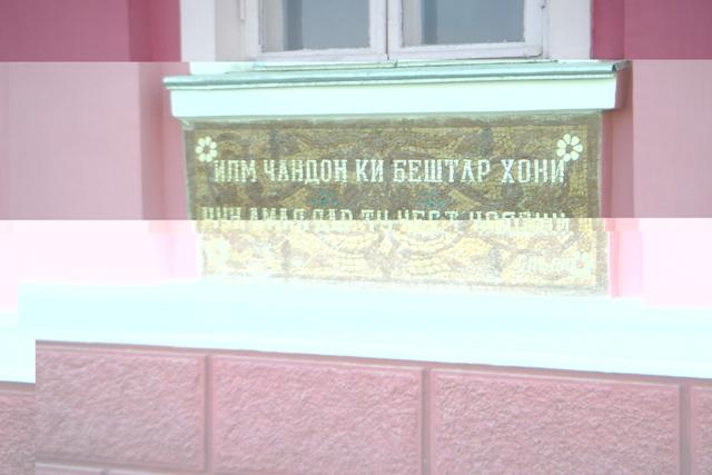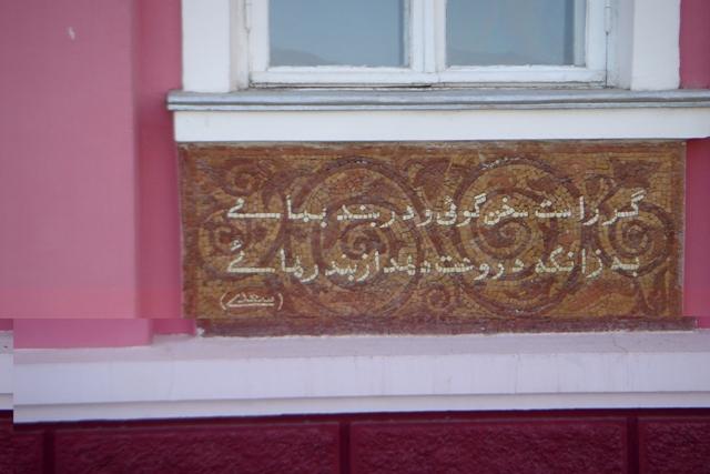 از سوی دیگر بازدیدی از بنای بزرگی به نام قصر ارباب داشتیم که بسیار خرسند کننده بود . این بنا که به لحاظ ساختاری بیشتر به کاخ فرمانداری و یا مقر ریاست جمهوری می مانست ، بر فراز تپه ای که در گذشته نام « قصر ارباب » بر خود داشته ، ساخته شده است . مدیر و برنامه ریز این کاخ در دوران شوروی رییس یکی از کالخوزهای منطقه بوده است . کالخوز ها ، تعاونی های کشاورزی بوده اند که از پیوستن چند و یا چندین روستا با هم به وجود آمده و به صورت دسته جمعی به کار کشاورزی می پرداختند . رییس این کالخوز مردی بزرگ به نام «سعید حاجی اوران حاجی اُف» بوده است که به لحاظ عظمت کارهایی که انجام داده بارها به عنوان قهرمان کار اتحاد شوروی برگزیده شده بود و به گفتۀ راهنمای ما در تعدادی از گردهمایی های بزرگ حزبی در مسکو نیز شرکت می کرد . ساختمان مذکور دارای یک تالار مردم خانه بزرگ و یک تالار جلسه کوچکتر بوده و اتاق کارهای متعدد داشت. در دو طرف بالای تالار اجتماعات راهرو بزرگی بود که احتمالا در مواقع شلوغ بخشی از مردم که در پایین جایی برای نشستن نمییافتند آنجا ایستاده و به سخنان سخنران گوش میدادهاند. سقف این بخش توسط چوبهای نقاشی شده مزین شده بود که نمونۀ آن را تنها در باغ نارنجستان شیراز دیده بودم که حکایت از پیوند ریشۀ این هنر در شیراز و خجند دارد. در قسمت دیگر این ساختمان یک موزه از کلیه اسباب و ابزارهای مورد استفاده در کالخوز ایجاد کرده بودند که هر یک به نوبه خود دیدنی و قابل تامل هستند، لیکن آنچه بیش از همه نظر را جلب میکرد یکی کتیبههایی بود که زیر همۀ پنجرههای طبقۀ اول ساخته شده و روی همۀ آن ها یک شعر فارسی ، یک در میان با خط فارسی و سریلیک نوشته شده بود که اکثرا از سعدی و دیگر شاعران بزرگ ایران تاریخی بودند . برای مثال روی یکی از آن ها - که عکسی نیز از آن گرفتم – به خط فارسی نوشته شده بود
