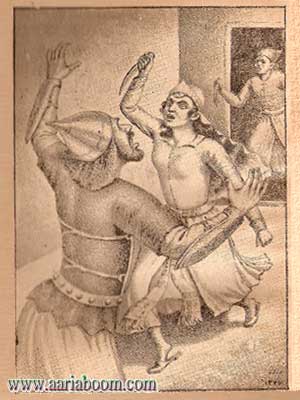 (به گلناز حمله کرده می خواهد او را به زور لکه دار نماید، گلناز در حین دفاع دست به کمر او برده خنجر را ربوده هجوم می آورد)
