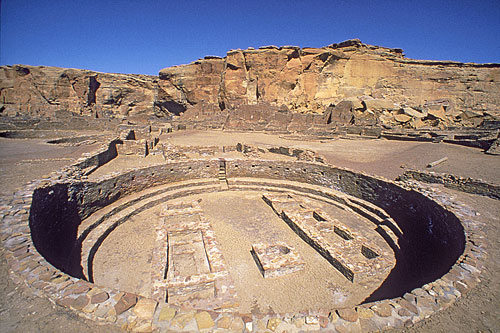 بالا ماکت یک پوئبلو بونیتو ( آپارتمان شهر های باستانی در نیومکزیکوی آمریکا) و پایین یک کیوای ساخته شده در آن
