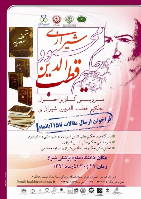 همایش دیدگاههای قطب الدین شیرازی، آثار و احوال این حکیم 29 و 30 آذرماه 1391 در دانشگاه علوم پزشکی شیراز برگزار میشود. در این همایش دیدگاهها، آثار و احوال حکیم قطب الدین محمود شیرازی مورد بحث و بررسی قرار میگیرد. فراخوان مقاله این همایش انجام شده و علاقهمندان میتوانند مقالات خود را تا 15 آبان به دبیرخانه این همایش ارسال کنند.