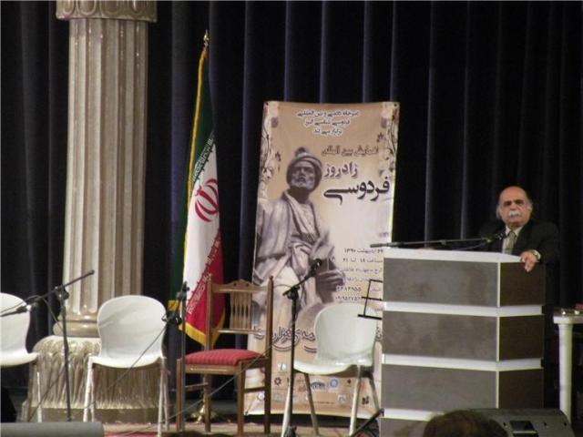 استادِ فرزانه دکتر محمدعلیِ اسلامیِ ندوشن که در پیشباز و بدرقهیِ باشندگان با تکریم و تشویقِ فراوان و پیدرپی روبهرو بودند به سخنرانی پرداختند و به بررسیِ فکر و زایشِ اندیشهیِ وی در قالبِ شاهنامه مطالبِ ارزندهای به مشتاقان پیشکشی نمودند. وی گوهرِ اندیشهیِ خیامی، نبردِ نیکی و بدی، داد و دهش، عرفانِ زمینی- انسانی را از ویژگیهایِ شخصیتِ سترگِ فردوسی و آشکارترین ویژگی نامهیِ ماندگار و جاویدانِ او دانست. رستم را نمادِ تبلورِ انسان شدن، ایرج را نمادِ آزادگی و آزادمنشی، سیاوش را جلوهیِ ایثارِ ایرانی برایِ ترجمانِ انسانیبودن شناسانده و کشتهشدنِ سلم و تور را به سَر سلامتی حق قلمداد کرد و فرزندانِ ایرجتبارِ ایران را به شاعرانگیِ خیالِ خیامی زیستن، داد و دهش، قدرشناسی از هم فراخواند.